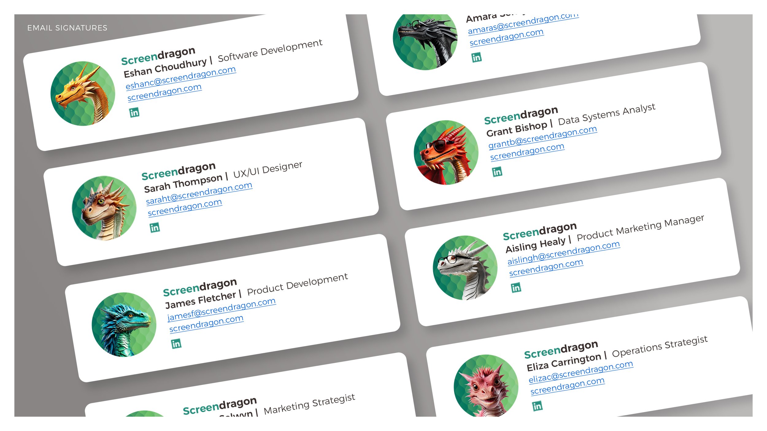 Once the brand was established, we extend the new creative platform into an array of assets. We began with delightful email signatures employees can create using a dragon of their choice. We added an engaging PowerPoint template. Screendragon got the new brand going with a brand launch bash at its headquarters in Ireland. And we rebuilt and launched an entirely new WordPress website for Screendragon.